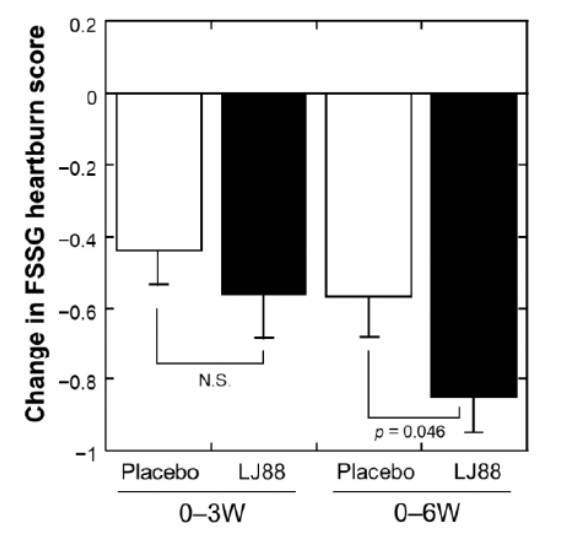 そこで健常な21~63歳の男女120人を対象に無作為プラセボ対照二重盲検並行群間比較臨床試験を実施したところ、胃食道逆流関連症状に関するFSSG問診票の胸焼けスコアにおいて、LJ88摂取群ではプラセボ群と比較して、有意な改善を認めた。同研究の論文は医学雑誌「Nutrients」にも投稿し注目を集めている。