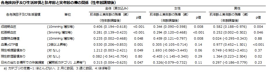 同研究では、「久山町研究」(日本の一般住民を対象に、60年以上にわたり行われている世界有数の長期・高精度の疫学追跡研究)で長年蓄積した健康診断データと生活習慣の情報を組み合わせて解析。肌年齢と生活習慣の関係性を確認した取り組みは日本初となる。生活習慣が将来のどのようなエイジング課題と関係するのかを見出すための検証をするため、アンケートや血液などの各種検査を行ったもので、その結果、肌の老化(肌年齢残差の上昇)は、生活習慣病の指標(血圧)、生活習慣、および身体機能の低下などと関連していることが明らかとなった。