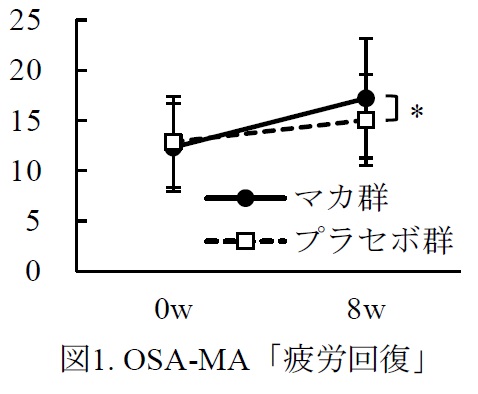 「BG1.2」の機能性については、自然閉経後3年以内の女性58人を対象とした臨床試験を実施。被験者に同素材300㎎/日もしくはプラセボを8週間摂取させ、睡眠の質の評価指標であるOSA‐MAおよび更年期障害の評価指標であるSIMスコアの変化を比較した。その結果、同素材摂取群ではOSA‐MAの「疲労回復」が有意に改善したほか【グラフ参照】、SMIスコア全体および「顔がほてる」「頭痛、めまい、吐き気が良くある」といった項目の改善も確認されている。